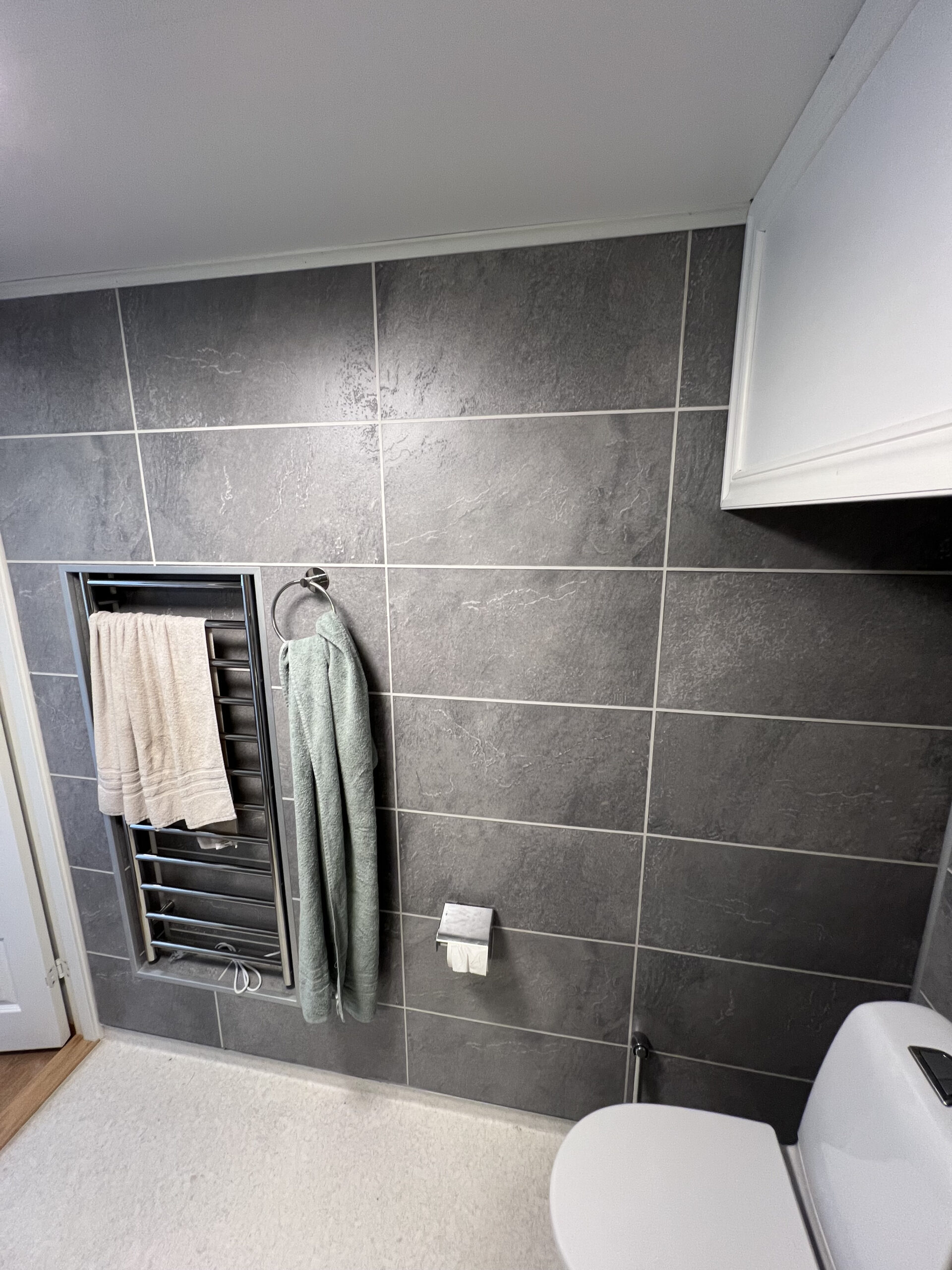 – We use seven Fibo packages per bathroom, and customers choose the décor that best suits their style. We recommend Fibo because we know it works, both during construction and in everyday use. This project uses 4008 Beige Stone, 1532 Negro Grande, and 5004 Gold Kitchen Board.