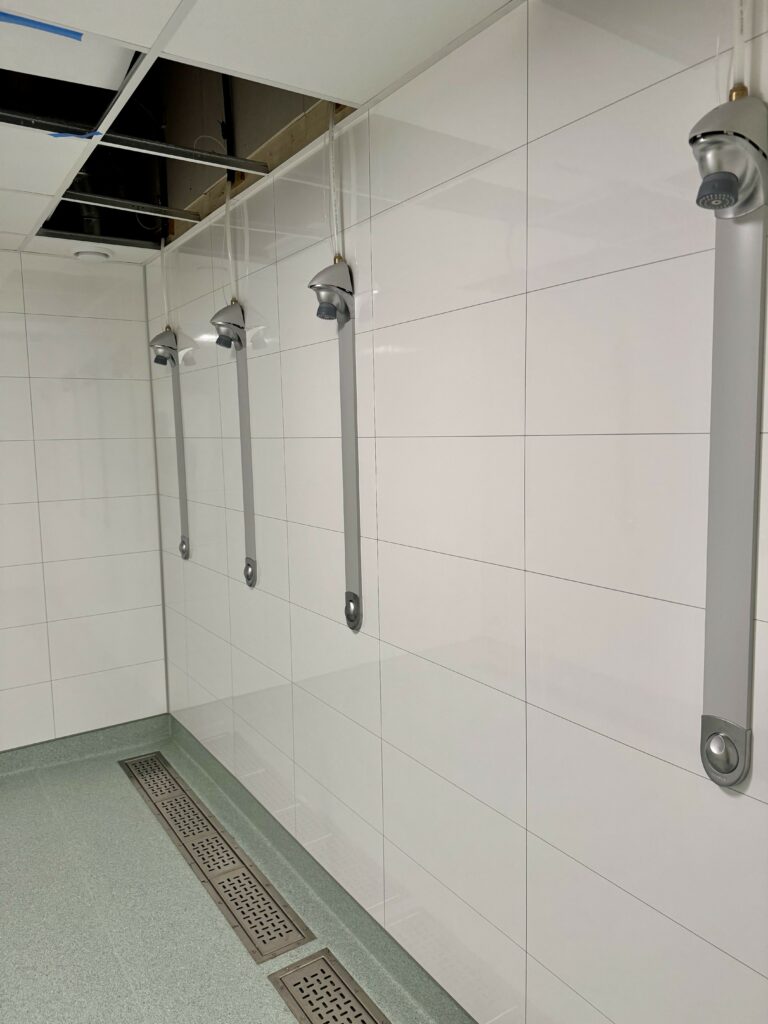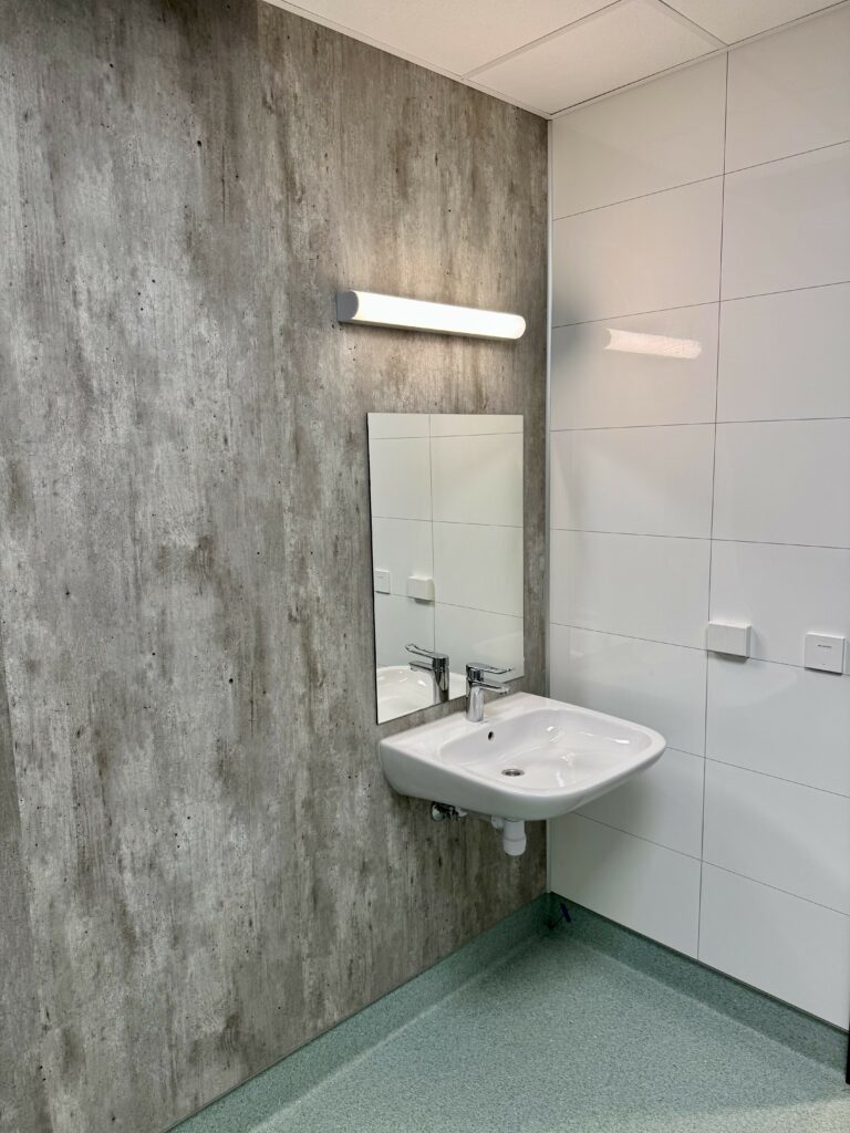 In other areas of the school with less stringent fire standards, Fibo’s waterproof wall system was chosen Two of Fibo’s most popular decors, Cracked Cement and Denver White, were used in shower areas, toilets and changing rooms. As pictured below, during construction.