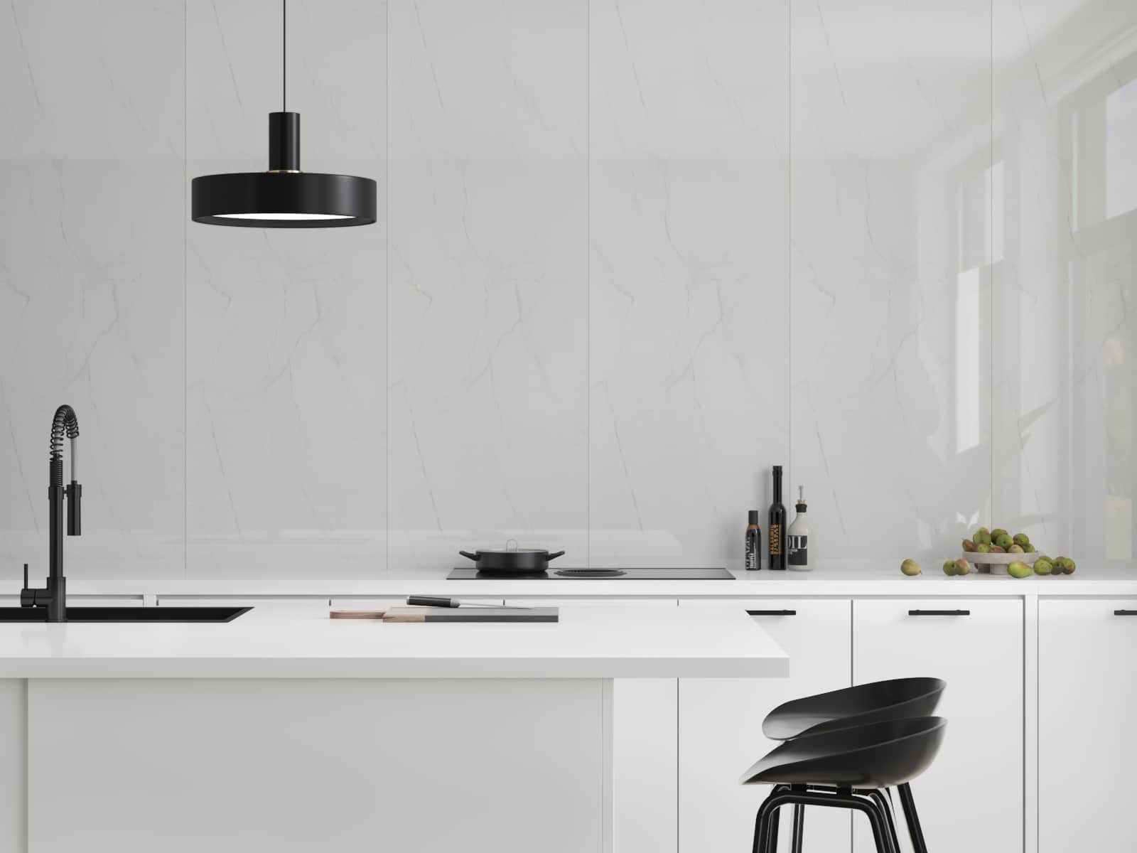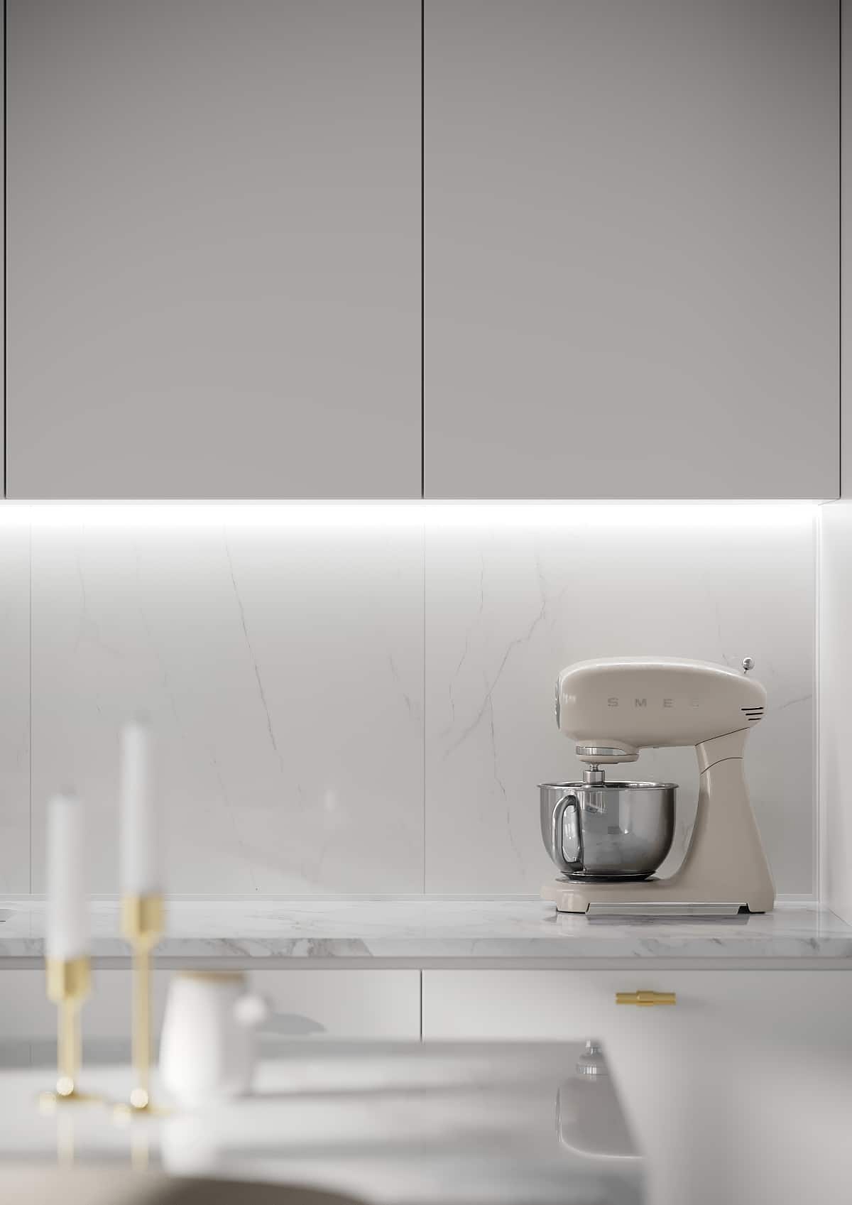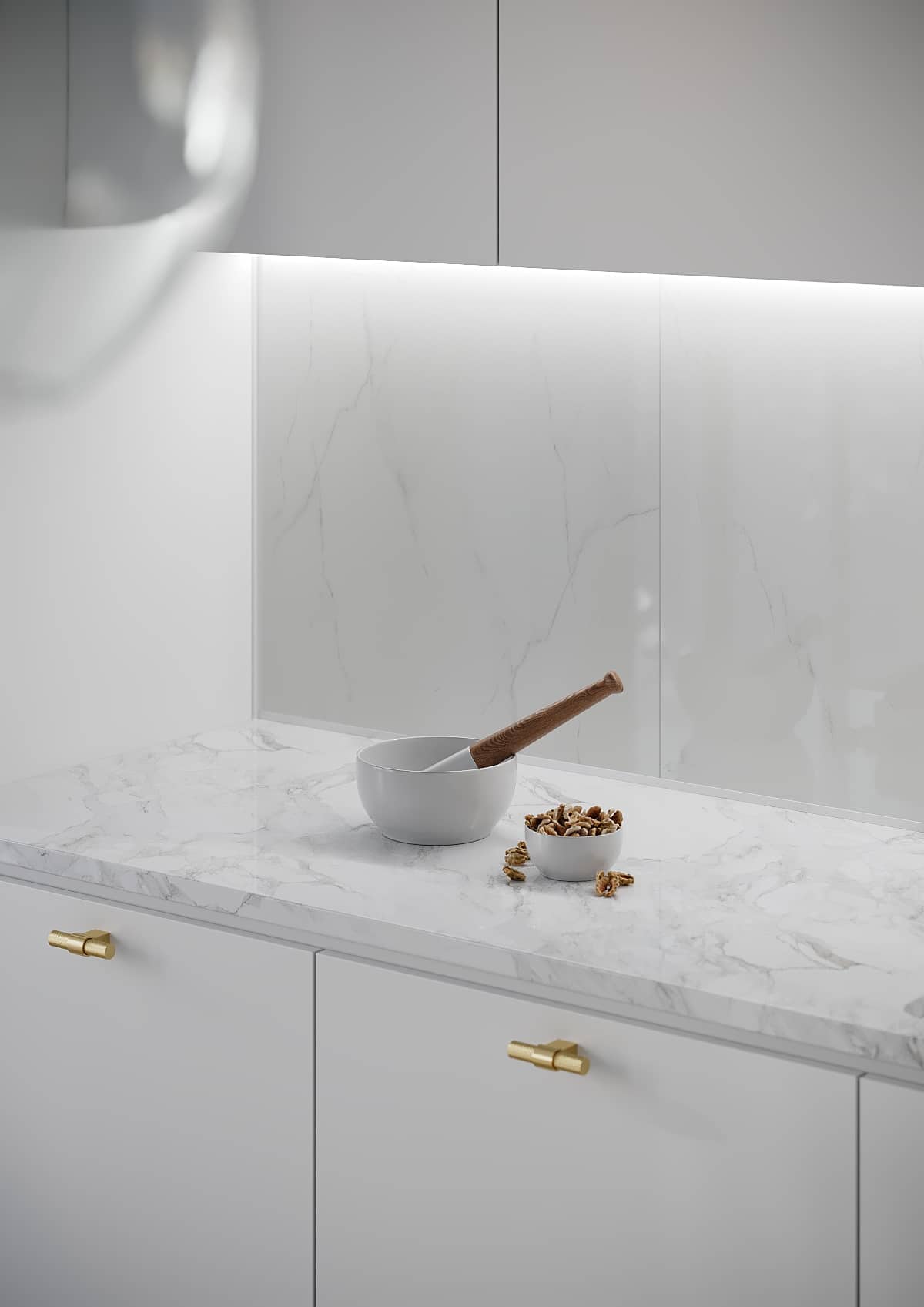 Our light marble décor brings a luxurious and elegant feel to your kitchen. Inspired by the look of Carrara marble, this kitchen board creates a striking focal point and elevates the overall style of your space. This décor is not only beautiful, but also durable and easy to maintain. The versatile style of light marble allows it to be combined effortlessly with a wide range of colour palettes and design styles.