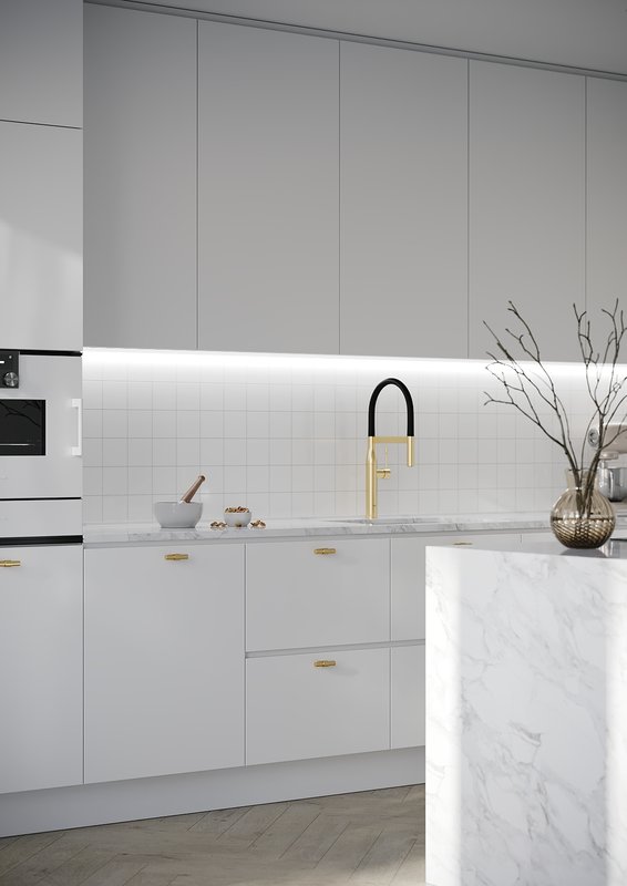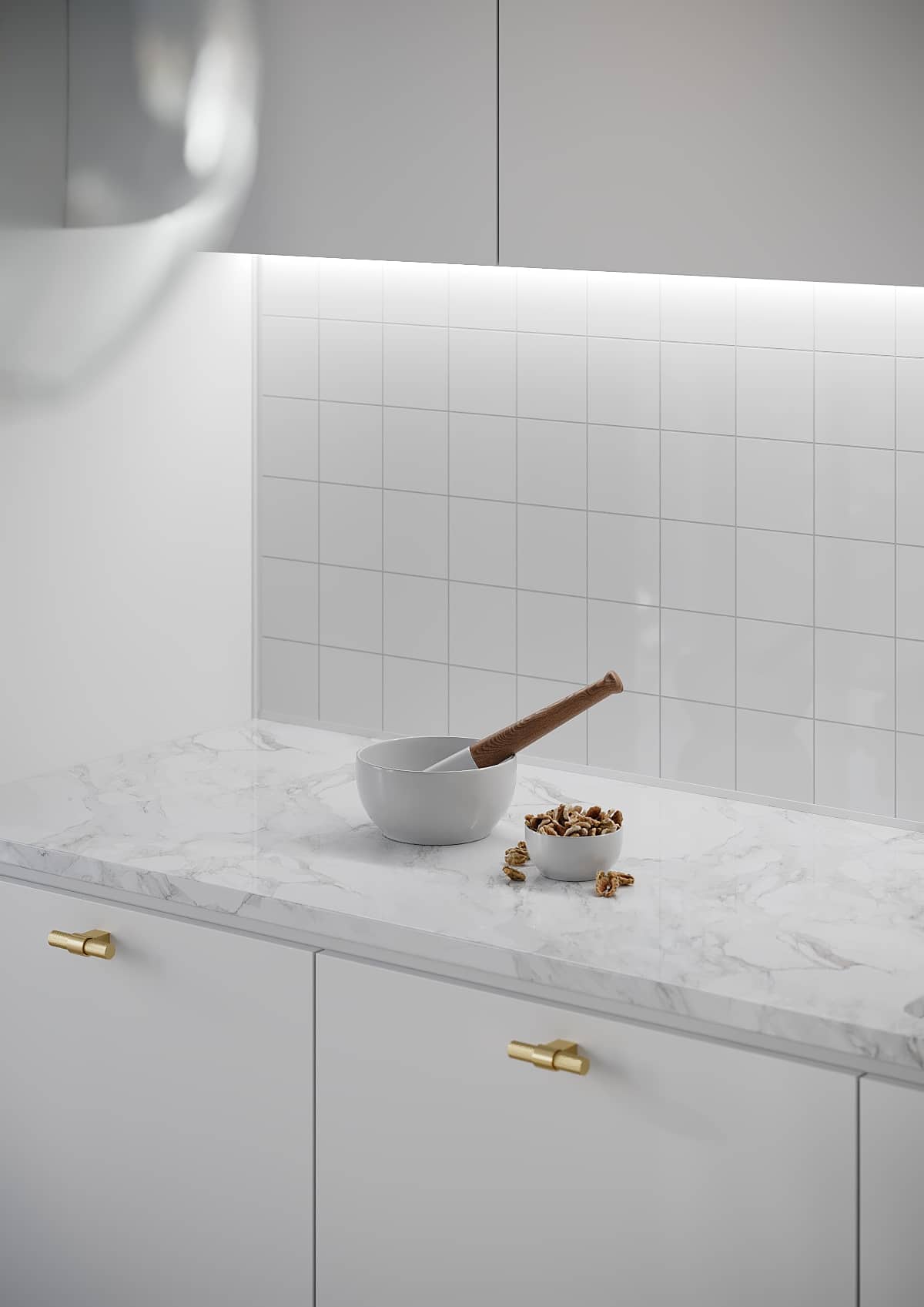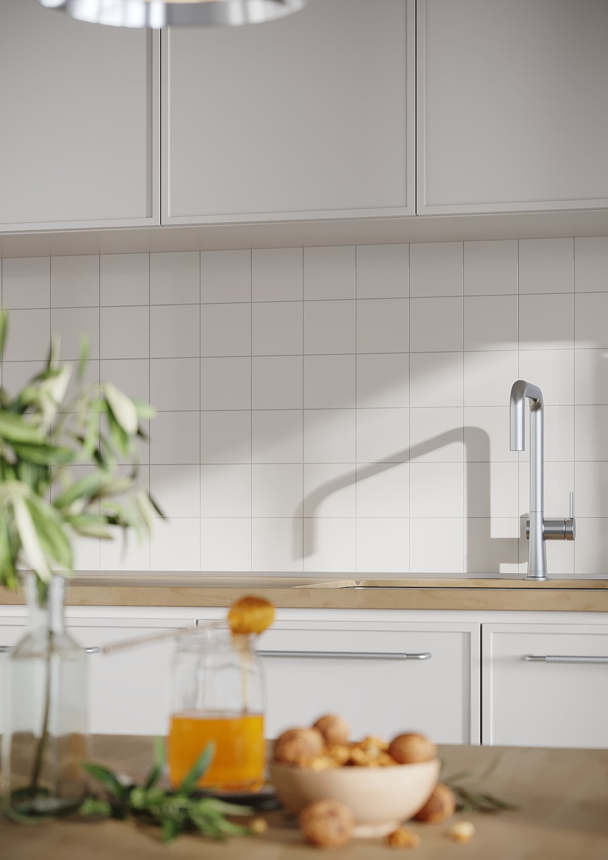 This high-gloss white decor is stylishly clean and timeless – creating a fresh kitchen expression! Available in Square Tiles (KM1010) and Horizontal Bars (KM3010).